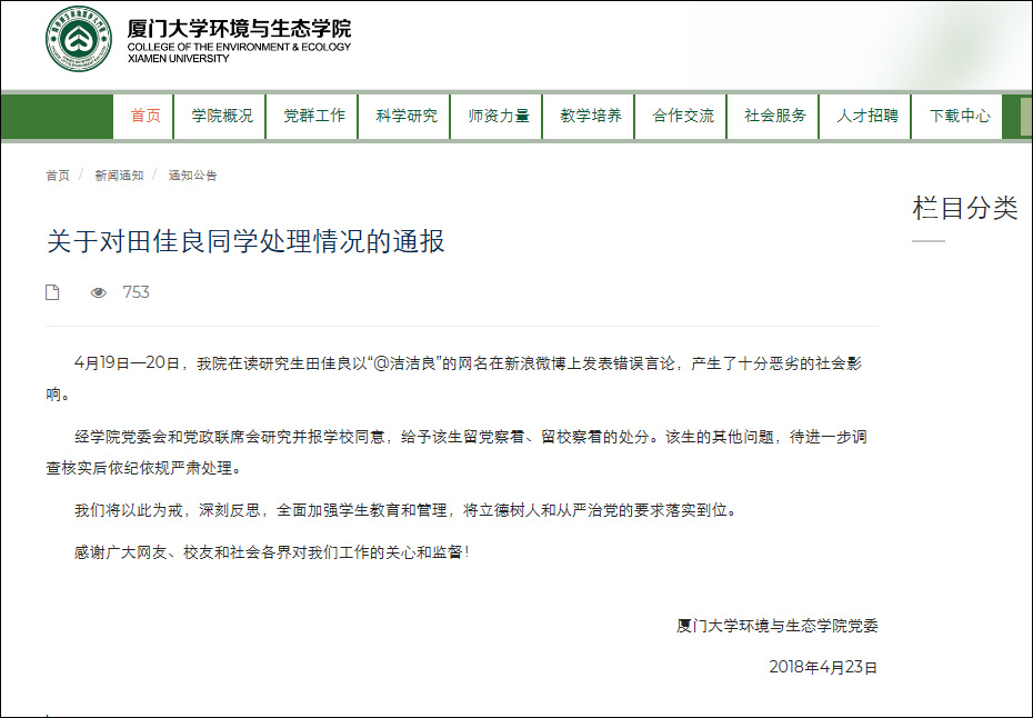 廈大最新通報出來了:給予發(fā)布辱華言論的田佳良留黨察看、留校察看處分。