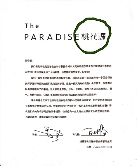 桃花源向海生態(tài)保護(hù)中心的28歲姑娘王春麗沒有想到,自己居然能夠得到馬云和馬化騰這兩位著名企業(yè)家聯(lián)合親筆簽名的賀信。日前,“二馬”以桃花源生態(tài)保護(hù)基金會(huì)聯(lián)席主席的身份,在信中祝賀她獲得白城市生態(tài)文明建設(shè)三等功,并感謝她和團(tuán)隊(duì)為向海生態(tài)保護(hù)做出的貢獻(xiàn)。