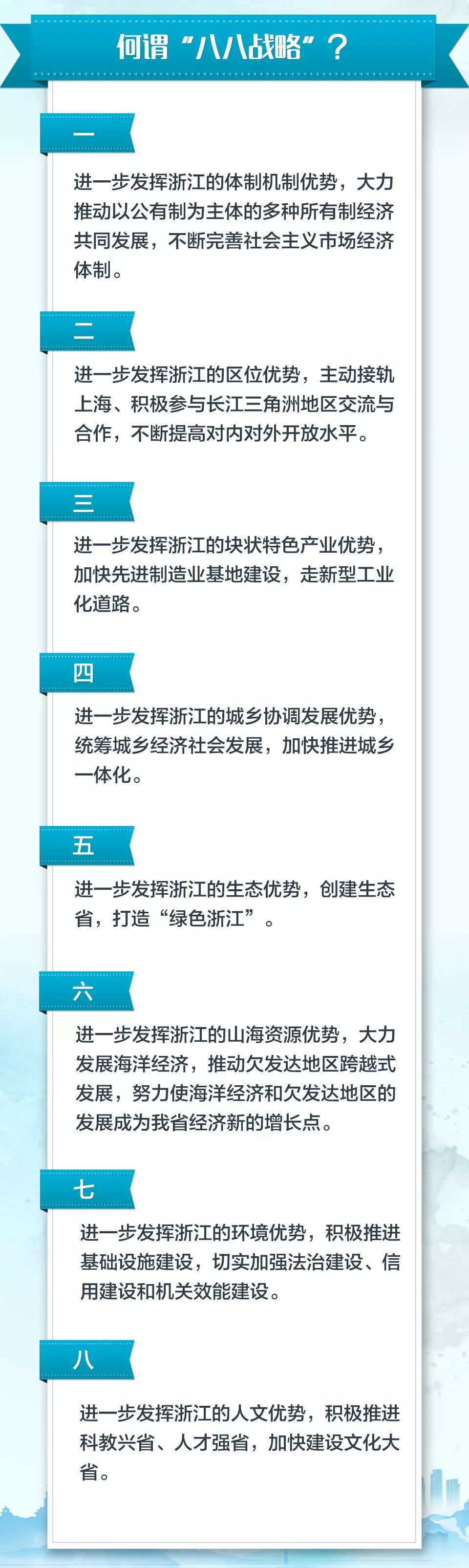 2003年7月,中共浙江省委舉行第十一屆四次全體(擴(kuò)大)會(huì)議,時(shí)任浙江省委書(shū)記習(xí)近平作工作報(bào)告,提出浙江面向未來(lái)發(fā)展的系統(tǒng)方案:即進(jìn)一步發(fā)揮“八個(gè)方面的優(yōu)勢(shì)”,推進(jìn)“八個(gè)方面的舉措”,簡(jiǎn)稱“八八戰(zhàn)略”。