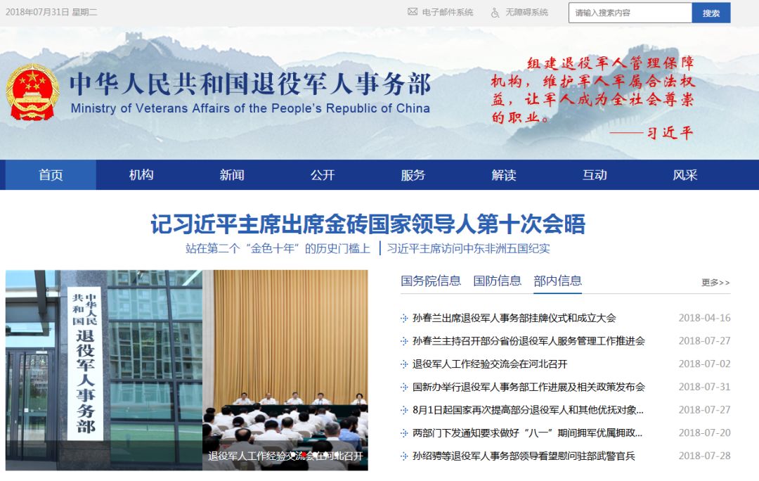 中華人民共和國退役軍人事務部門戶網站于7月31日上線運行,網址為www.mva.gov.cn。網站開設機構、新聞、公開、服務、解讀、互動、風采等頻道,秉承“維護軍人軍屬合法權益,讓軍人成為全社會尊崇的職業(yè)”這一宗旨,向全社會宣傳退役軍人為黨、國家和人民犧牲奉獻的精神風范和價值導向,提供“互聯(lián)網+退役軍人服務”,打造退役軍人工作信息公開、政策發(fā)布解讀和及時回應關切的第一平臺。