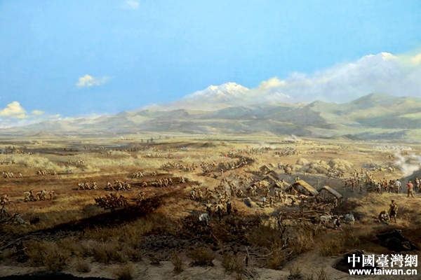 巨幅半景畫《屯墾戍邊》吸引記者們駐足圍觀。(中國臺灣網(wǎng) 尹賽楠 攝)