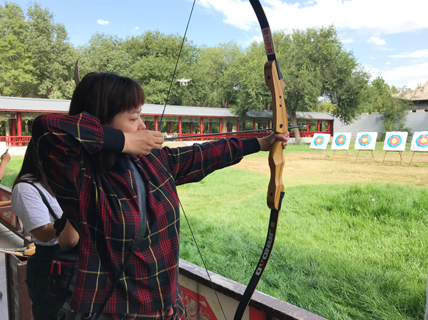 游人在錫伯古城體驗射箭 新華網(wǎng) 周欣攝