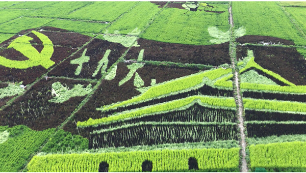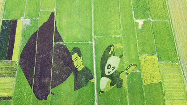 在察布查爾縣納達齊牛錄鄉(xiāng),有一片總占地面積600多畝的稻田畫,游人們站在27米的觀光塔上,可以清晰地看到“戰(zhàn)狼2”“功夫熊貓”“米老鼠唐老鴨”等彩稻組成的圖案。這個名叫“綠夢飛揚”的稻田畫基地始建于2015年,水稻品種均引自沈陽市沈北新區(qū)彩色水稻系列。