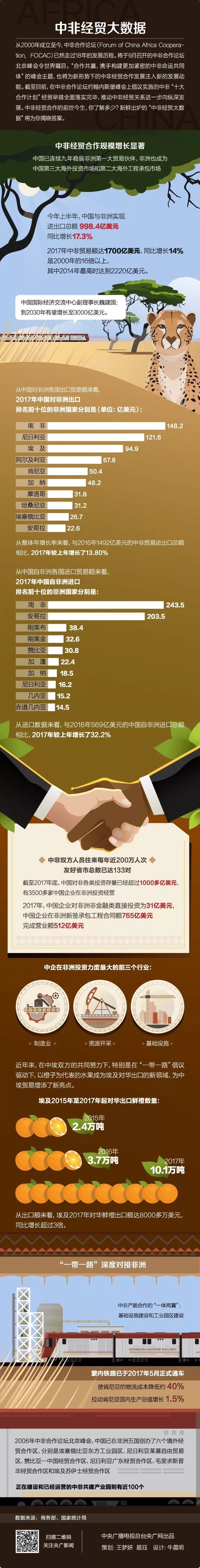 目前,中國已經(jīng)連續(xù)九年成為非洲第一大貿(mào)易伙伴國,2017年中非貿(mào)易額達1700億美元,同比增長14%。今年1-6月,中非貿(mào)易額達988億美元,同比增長16%。