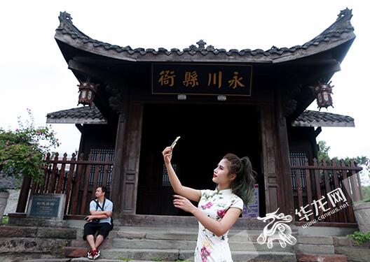 永川縣衙的古樸建筑飽含了歲月的滄桑,一名游客正在前門拍照。記者 謝鵬 攝