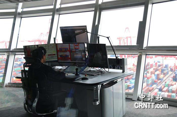 兩岸媒體聽取洋山港四期尚東分公司負(fù)責(zé)人的簡報(bào)后,兩岸記者來到中控塔解碼“無人碼頭”的秘密,看到只有一名員工在工作臺(tái)前遠(yuǎn)程操控,從中控室望下去,記者真的很少看到工人勞作的身影,只有一架架吊車在有序的進(jìn)行自動(dòng)化工作。