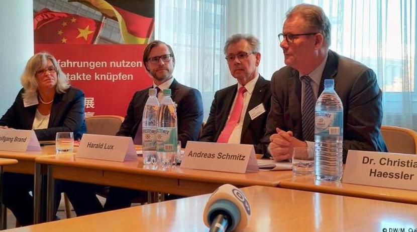 德中經(jīng)濟聯(lián)合會顧問委員會主席施密茨(右一)正在新聞發(fā)布會上發(fā)言。圖片來源:德國之聲網(wǎng)站報道截圖