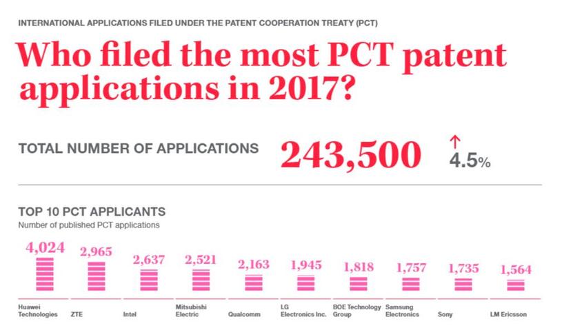 華為和中興兩家中國企業(yè)雄踞專利申請榜前兩位。圖片來源:世界知識產(chǎn)權(quán)組織(WIPO)官網(wǎng)截圖
