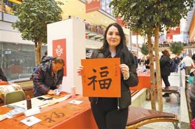 瑪?shù)倌纫彩沁B續(xù)幾年都來波茨坦廣場參加活動,今年她特意請來自深圳的書法家徐子屏為她在紅紙上寫下“福”“壽”“康”“樂”四個大字!耙淮尉褪斋@那么多來自中國的祝福讓我非常開心。感謝‘歡樂春節(jié)’活動,讓我們也能親身體驗中國年的喜慶氛圍”,她向記者展示了購得的剪紙作品,顯得非常開心。