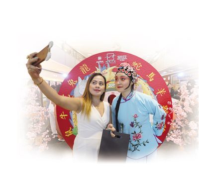 在菲律賓馬尼拉舉辦的“新春歡慶周”活動上,熱心的現(xiàn)場觀眾和紅溪禮示大學孔子學院的京劇表演志愿者自拍留念。 本報記者 趙益普攝