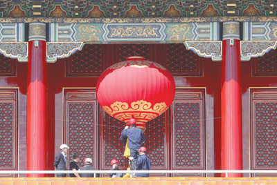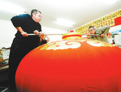準(zhǔn)備使用前,兩名工人壓開燈籠。本報(bào)記者賀勇攝。