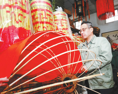 北京市美術(shù)紅燈廠工人將紅色布料貼在骨架上。本報(bào)記者賀勇攝。