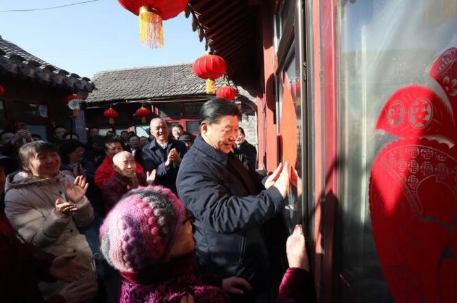 看到總書記到來,大家都很激動,紛紛向總書記問好。居民侯雅明現(xiàn)場寫下一副春聯(lián),給總書記拜年。習(xí)近平高興地拿起一幅“!弊郑H自貼到門上,給這里的老街坊們拜年。
