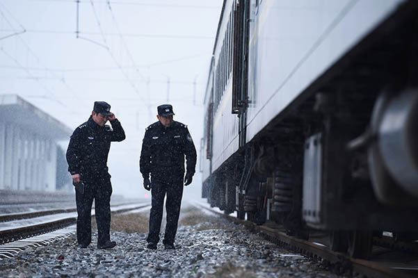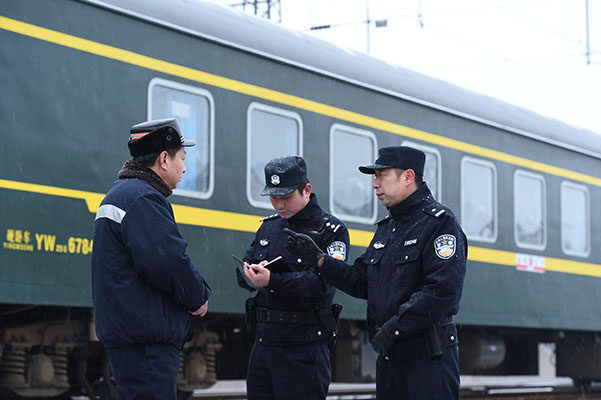 ↑武漢鐵路公安局襄陽公安處民警與鐵路職工對增開旅客列車進(jìn)行巡查。