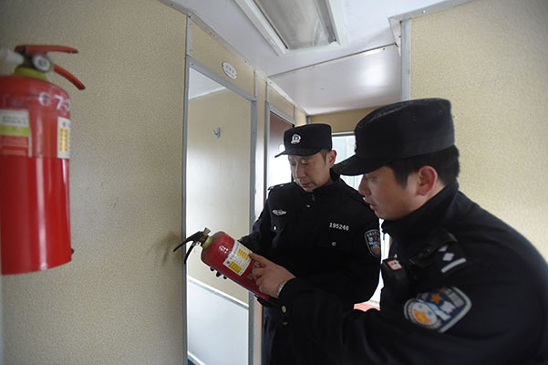 ↑武漢鐵路公安局襄陽公安處民警對增開旅客列車消防器材進(jìn)行巡查。