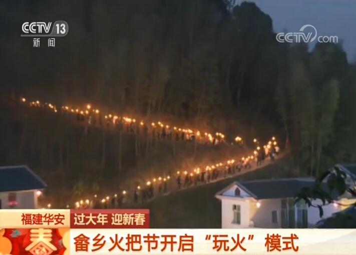 在福建華安縣高安鎮(zhèn)坪水村,到處張燈結(jié)彩,一片喜慶氛圍。畬鄉(xiāng)火把節(jié)吸引了八方來客,慕名而來的游客和村民陸續(xù)點燃手中的火把,排起長隊穿梭在山上,宛如一條百米長龍,遠處望去流光溢彩、美不勝收。隊伍所經(jīng)過的人家,煙花禮炮齊放,璀璨奪目。大家歡聚在美麗的村寨,觀看畬族傳統(tǒng)歌舞,共度新春佳節(jié)。