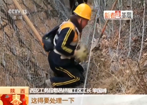將近90度的陡坡,完全沒有路,腳下踩著防護(hù)網(wǎng),手上也緊緊抓住防護(hù)網(wǎng),單國(guó)峰帶著大家,就這樣一步一步挪到隧道口上方。在一處凸起的大石頭上,單國(guó)峰發(fā)現(xiàn)有隱患。