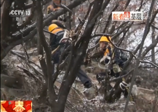 單國(guó)峰:再挖一個(gè)坑,就有地方站腳了。碰見這種情況是遇山就要開路呢。來上,踩穩(wěn),好,上來了,拉穩(wěn)繩子啊,好。