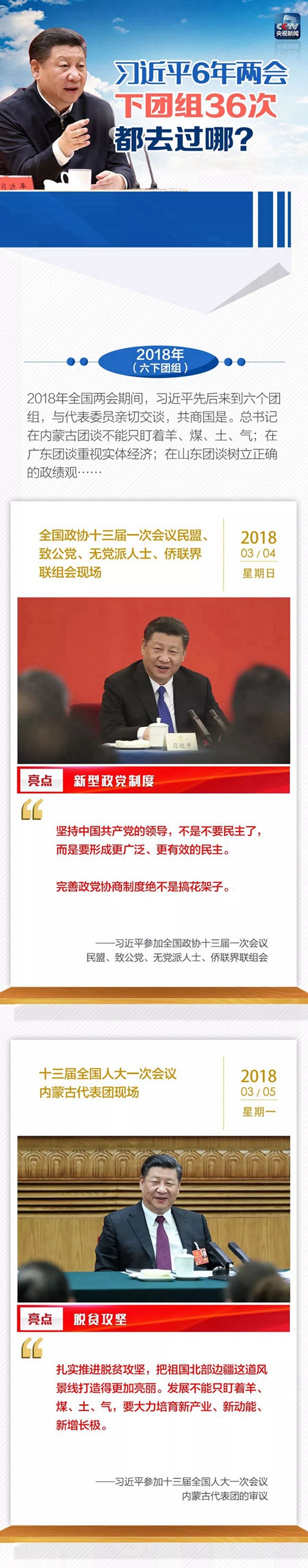 2019年全國兩會來了;仡2013-2018年全國兩會,習近平先后36次“下團組”,和代表委員親切交流、共商國是,講話涉及科技創(chuàng)新、脫貧攻堅、深化改革、作風建設等。今天,一張圖回顧習近平的兩會時間!