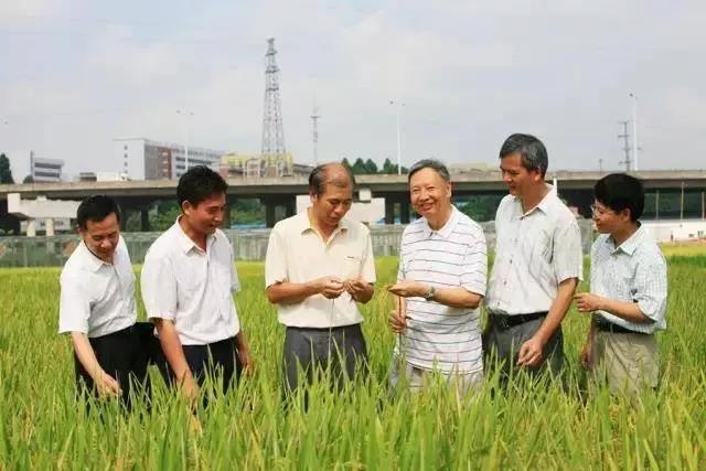 △ 盧永根(右三)團(tuán)隊在田間觀察水稻生長情況 圖源:南方日報