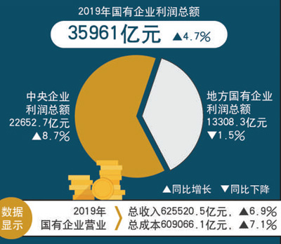 2019年,國有企業(yè)營業(yè)總收入625520.5億元,同比增長6.9%。其中,中央企業(yè)358993.8億元,同比增長6.0%;地方國有企業(yè)266526.7億元,同比增長8.2%。