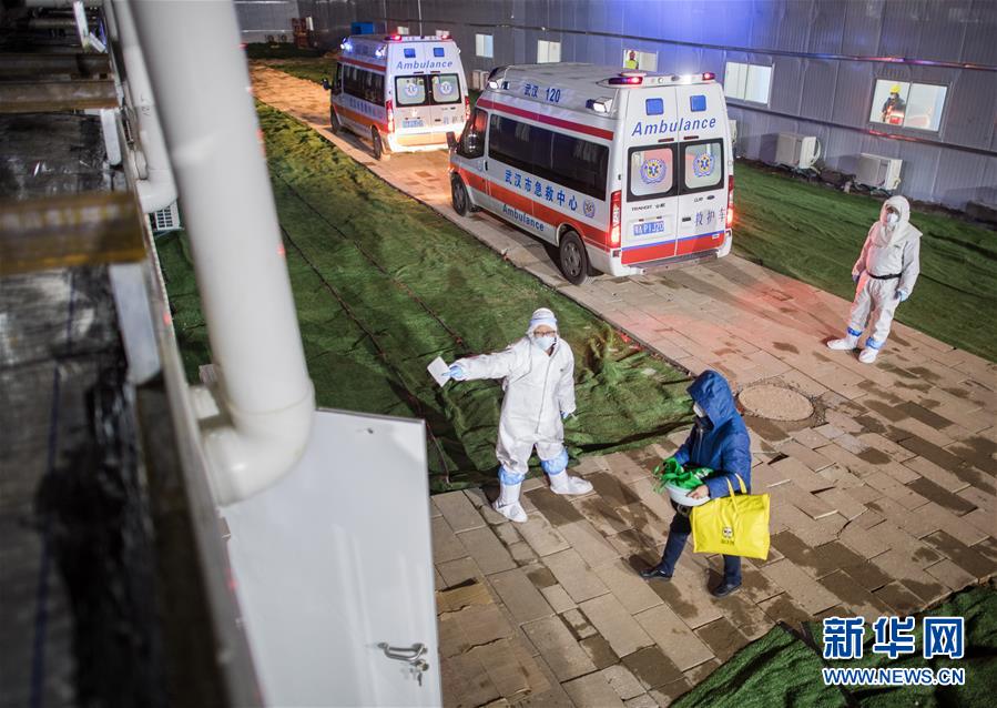 2月4日,在武漢火神山新型冠狀病毒感染肺炎?漆t(yī)院,醫(yī)護(hù)人員將患者送入病房(無人機(jī)照片)。 新華社記者肖藝九攝