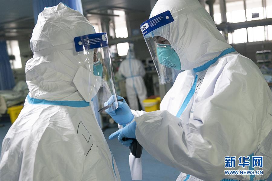 1月24日,在武漢大學(xué)中南醫(yī)院重癥隔離病房,醫(yī)護(hù)人員在隔離服上寫下名字,方便辨認(rèn)。 新華社記者熊琦攝