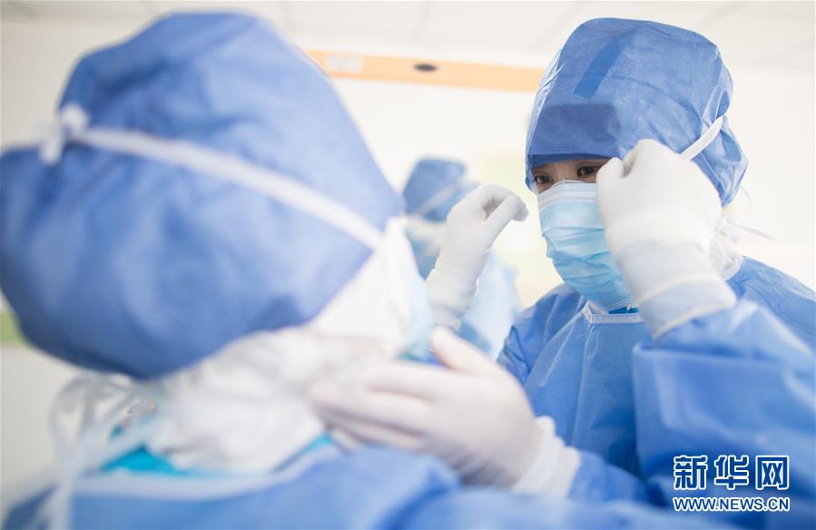 2月22日,在武漢市第一醫(yī)院,醫(yī)務人員進隔離病區(qū)前穿戴防護服。新華社記者 肖藝九 攝