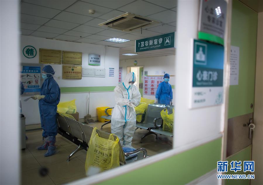 2月22日,醫(yī)務人員在武漢市第一醫(yī)院隔離病區(qū)排隊等待進入緩沖區(qū),換掉污染衣物。新華社記者 肖藝九 攝