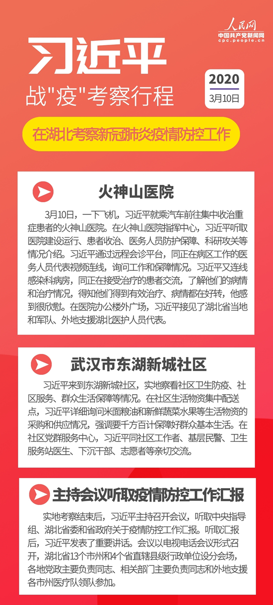3月10日,在抗擊新冠肺炎疫情的關(guān)鍵時(shí)刻,習(xí)近平專門赴湖北省武漢市考察疫情防控工作,看望慰問奮戰(zhàn)在一線的廣大醫(yī)務(wù)工作者、解放軍指戰(zhàn)員、社區(qū)工作者、公安干警、基層干部、下沉干部、志愿者和患者群眾、社區(qū)居民。