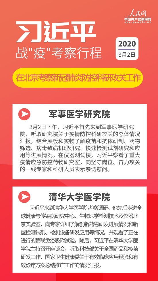 3月2日,習(xí)近平在北京考察新冠肺炎防控科研攻關(guān)工作,代表黨中央向奮斗在疫情防控科研攻關(guān)一線的廣大科技工作者表示衷心的感謝和誠(chéng)摯的問候。
