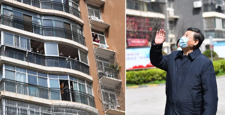 這是習(xí)近平在東湖新城社區(qū)考察時,向在家隔離居住的居民揮手致意、表示慰問。
