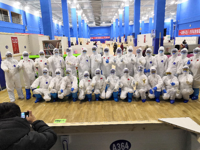 △國家(江西)緊急醫(yī)學救援隊隊員們在方艙醫(yī)院內(nèi)合影