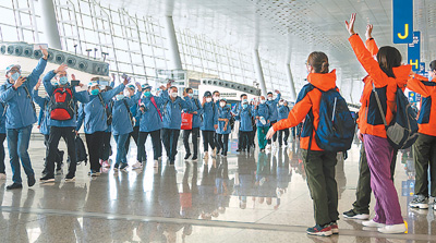 3月17日,在武漢天河機(jī)場,山東國家緊急醫(yī)學(xué)救援隊隊員(左側(cè))向江蘇國家緊急醫(yī)學(xué)救援隊隊員揮手致意。新華社記者 熊 琦攝