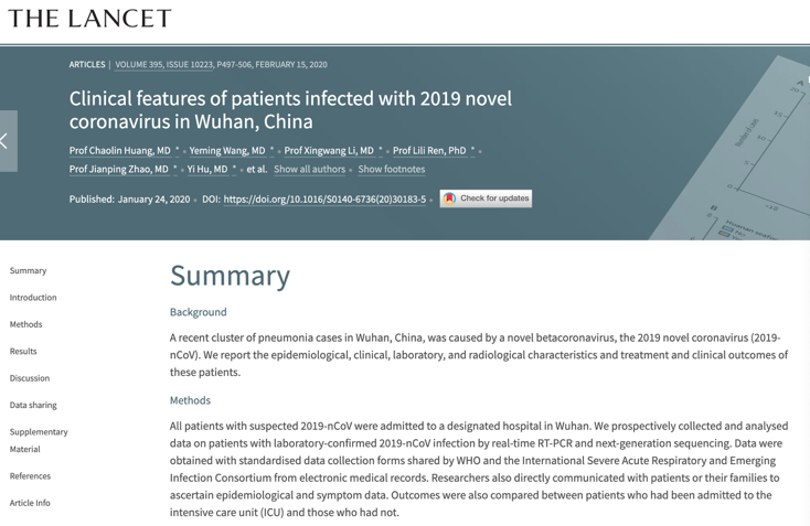 1月24日,中國(guó)科研人員在《柳葉刀》上首次報(bào)告了一種由新型冠狀病毒引發(fā)的疾病,描述了41位患者的病情和癥狀。中國(guó)科研人員強(qiáng)烈建議為公共衛(wèi)生工作者提供個(gè)人防護(hù)設(shè)備,一旦發(fā)現(xiàn)疑似病例,應(yīng)立即進(jìn)行病毒檢測(cè)。鑒于這種新病毒的“大流行潛力”,他們敦促各方對(duì)其進(jìn)行仔細(xì)的監(jiān)測(cè)。