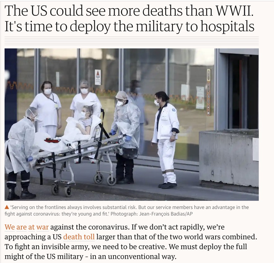 19日,來自哈佛大學(xué)、麻省理工大學(xué)和加州大學(xué)圣地亞哥分校的三位美國(guó)學(xué)者在英國(guó)《衛(wèi)報(bào)》發(fā)文說:“我們正在與新冠病毒作戰(zhàn)。如果我們不迅速采取行動(dòng),美國(guó)的死亡人數(shù)將超過兩次世界大戰(zhàn)死亡人數(shù)的總和!