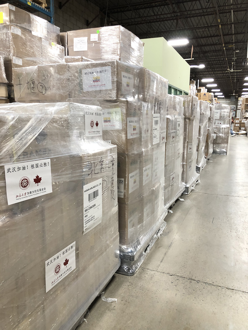 據(jù)北京大學(xué)加拿大校友基金會(huì)創(chuàng)會(huì)理事房震宇介紹,新冠肺炎疫情發(fā)生以來,北京大學(xué)加拿大校友基金會(huì)作為聯(lián)合捐贈(zèng)的總協(xié)調(diào)人,在國內(nèi)航空公司和物流的支持下,累計(jì)向湖北武漢等抗疫前線醫(yī)院捐贈(zèng)防護(hù)服、醫(yī)用口罩、護(hù)目鏡及醫(yī)用手套等防護(hù)物資25個(gè)航空貨運(yùn)托盤,總重量超過8噸、總價(jià)值近300萬人民幣。