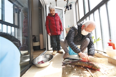 3月19日,武漢市漢陽區(qū)四新街道梅林都匯社區(qū),兩位老人正在家中打理社區(qū)志愿者們剛剛送來的活草魚。老人說,疫情發(fā)生后,老兩口一直隔離在家,生活上很多小事情都是社區(qū)幫著解決,日子過得很平穩(wěn),身體也很好,請大家放心。