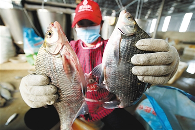 3月17日,武漢市東西湖區(qū)東山街道群力村,工人在武漢錦軍水產(chǎn)專業(yè)合作社內(nèi)分裝活鮮武昌魚。