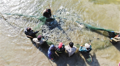 3月17日,參加捕撈的工人告訴記者,要把最肥最好的活魚送上武漢人的餐桌。