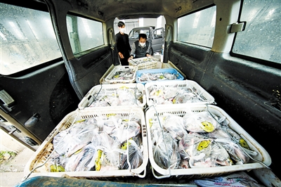 3月17日,武漢市東西湖區(qū)東山街道群力村,人們爭分奪秒地往車上裝運活鮮魚。1小時后,它們將準時抵達專供的社區(qū)。