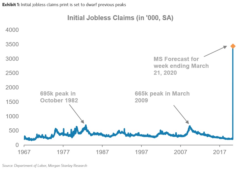 隨著疫情的擴大,美國多州采取了日趨嚴格的出行限制措施,其造成的經(jīng)濟影響也越來越明顯。美國勞工部19日的數(shù)據(jù)顯示,截至3月14日一周,美國首次申領失業(yè)救濟人數(shù)環(huán)比大幅攀升7萬人至28.1萬人,增幅達到兩年半以來最大。隨著美國各州和地方政府逐步下令關閉各類場所,摩根斯坦利預測美國上周(截至21日)首次申領失業(yè)救濟的人會達到340萬人。