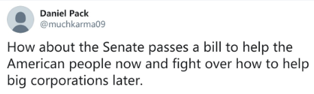 參議院兩黨就不能先通過一個能幫助美國人民的協(xié)議然后再為如何幫助大企業(yè)干架。