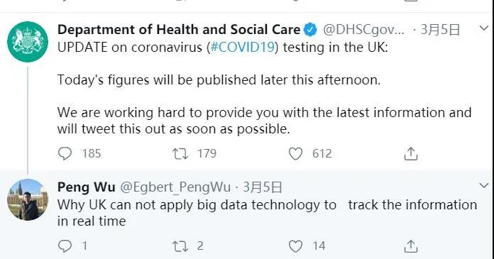 3月5日,英國衛(wèi)生與社會保障部在其官方推特上發(fā)布一條貼文稱,將會努力為網(wǎng)友提供最新的數(shù)據(jù)。英國利茲大學留學的吳芃看到后,在底下留言發(fā)問“為什么英國不能利用大數(shù)據(jù)技術(shù),實時跟蹤信息?”