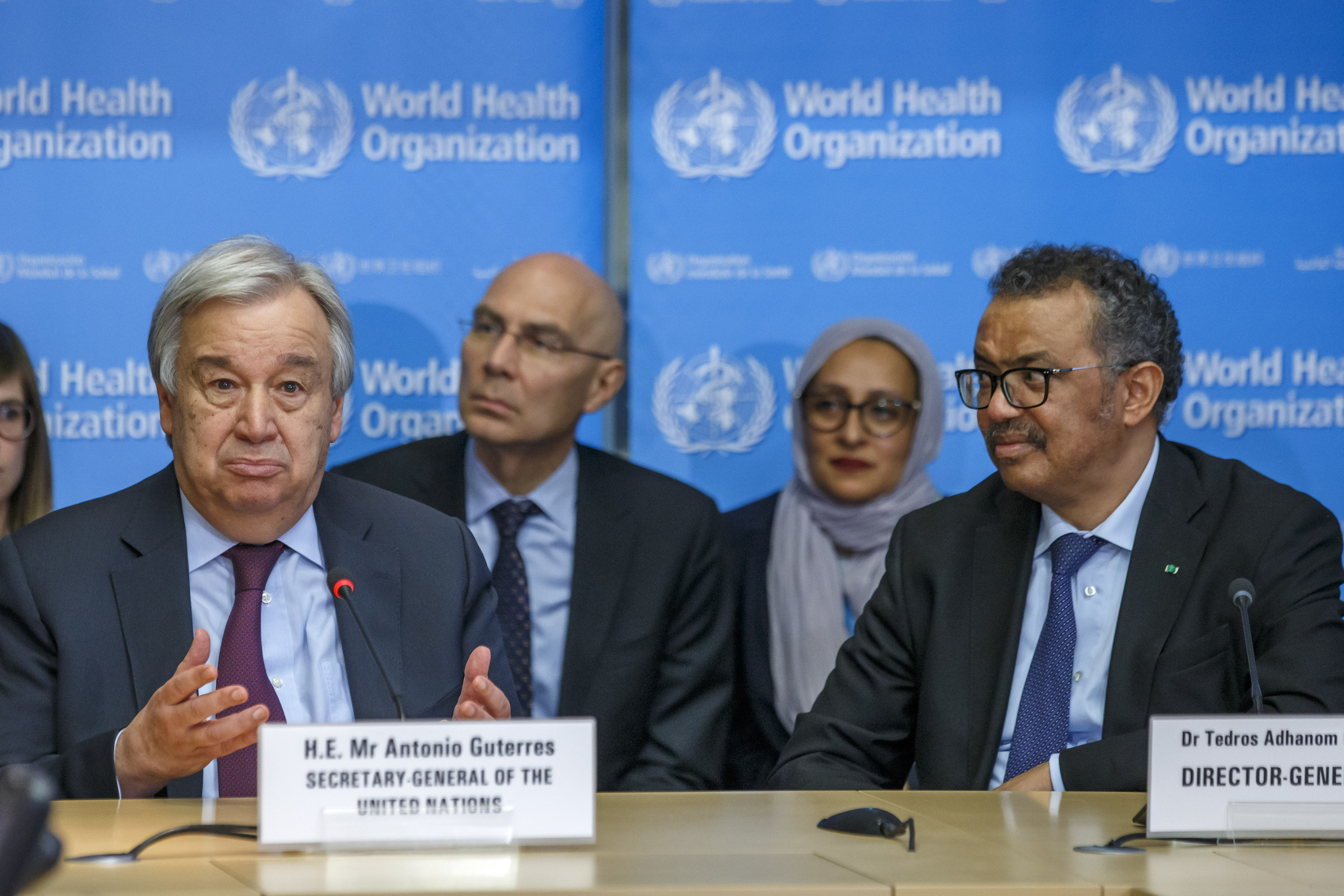 2月24日,在瑞士日內(nèi)瓦,聯(lián)合國(guó)秘書長(zhǎng)古特雷斯(左)在世界衛(wèi)生組織總部發(fā)表講話。古特雷斯表示,中國(guó)人民為盡量減輕新冠肺炎疫情造成的負(fù)面影響,實(shí)施嚴(yán)格的防控措施,以犧牲正常生活的方式為全人類做出了貢獻(xiàn)。新華社發(fā)