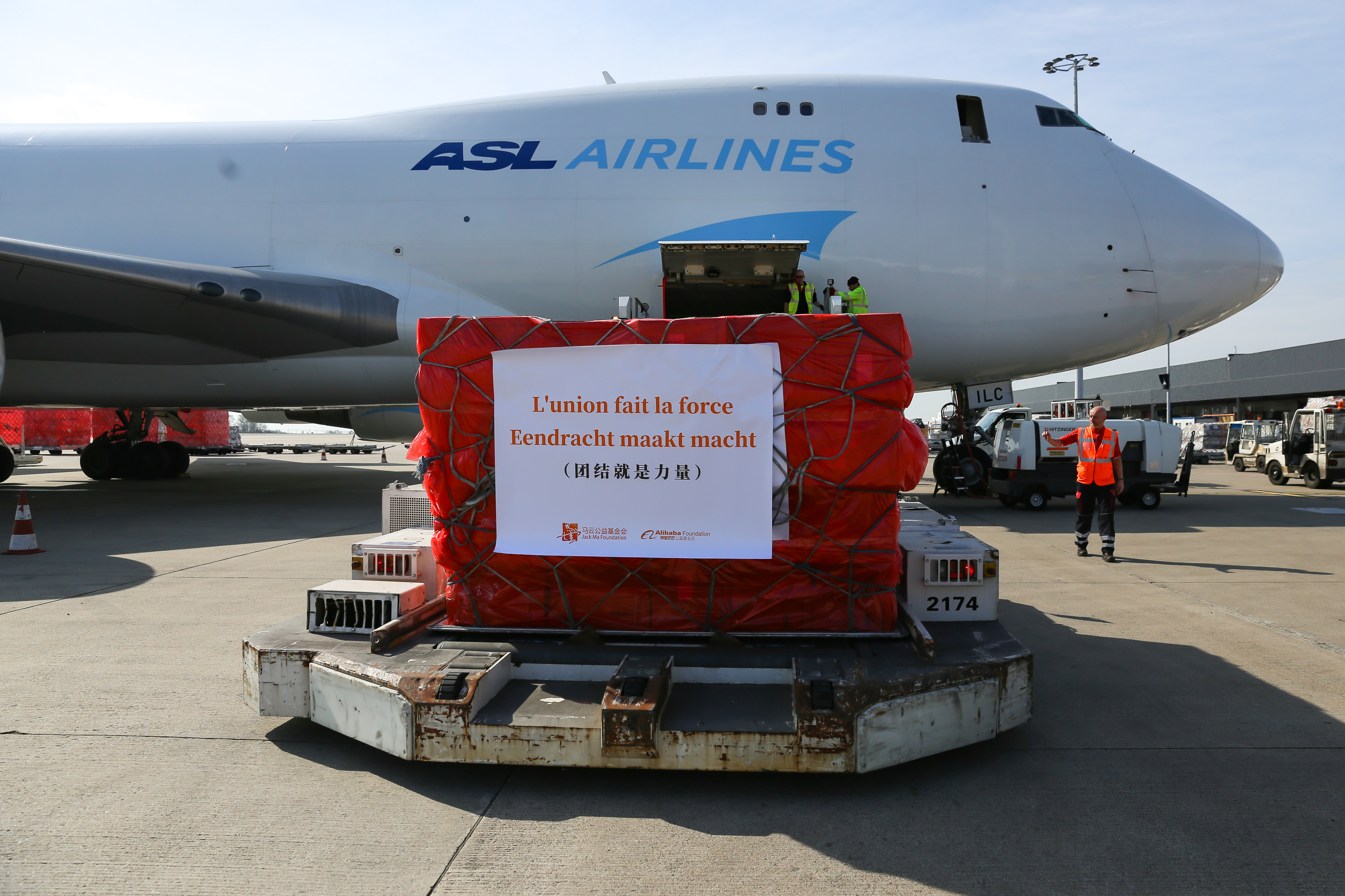 3月16日,在比利時(shí)列日機(jī)場(chǎng),工作人員運(yùn)送口罩包裹。來(lái)自中國(guó)的30萬(wàn)只口罩當(dāng)?shù)貢r(shí)間16日中午運(yùn)抵比利時(shí)列日機(jī)場(chǎng)。這是歐洲新冠肺炎疫情暴發(fā)以來(lái),比利時(shí)首次得到大規(guī)模外來(lái)援助。這批物資由阿里巴巴公益基金會(huì)和馬云公益基金會(huì)提供。新華社記者 張鋮 攝