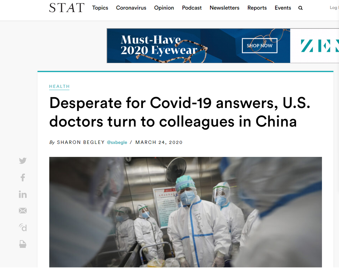 這是來自美國(guó)《波士頓環(huán)球報(bào)》旗下健康新聞網(wǎng)站STAT的一篇題為《渴望獲得新冠肺炎病毒信息 美國(guó)醫(yī)生求助中國(guó)的同行》的文章的開篇