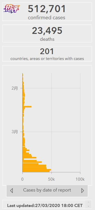 與此同時(shí),境外疫情形勢嚴(yán)峻。世衛(wèi)組織實(shí)時(shí)統(tǒng)計(jì)數(shù)據(jù)顯示,截至歐洲中部時(shí)間3月27日18時(shí)(北京時(shí)間3月28日1時(shí)),全球確診新冠肺炎512701例,死亡23495例,目前全球已有201個(gè)國家地區(qū)出現(xiàn)新冠肺炎病例,中國以外新冠肺炎確診約43萬例。