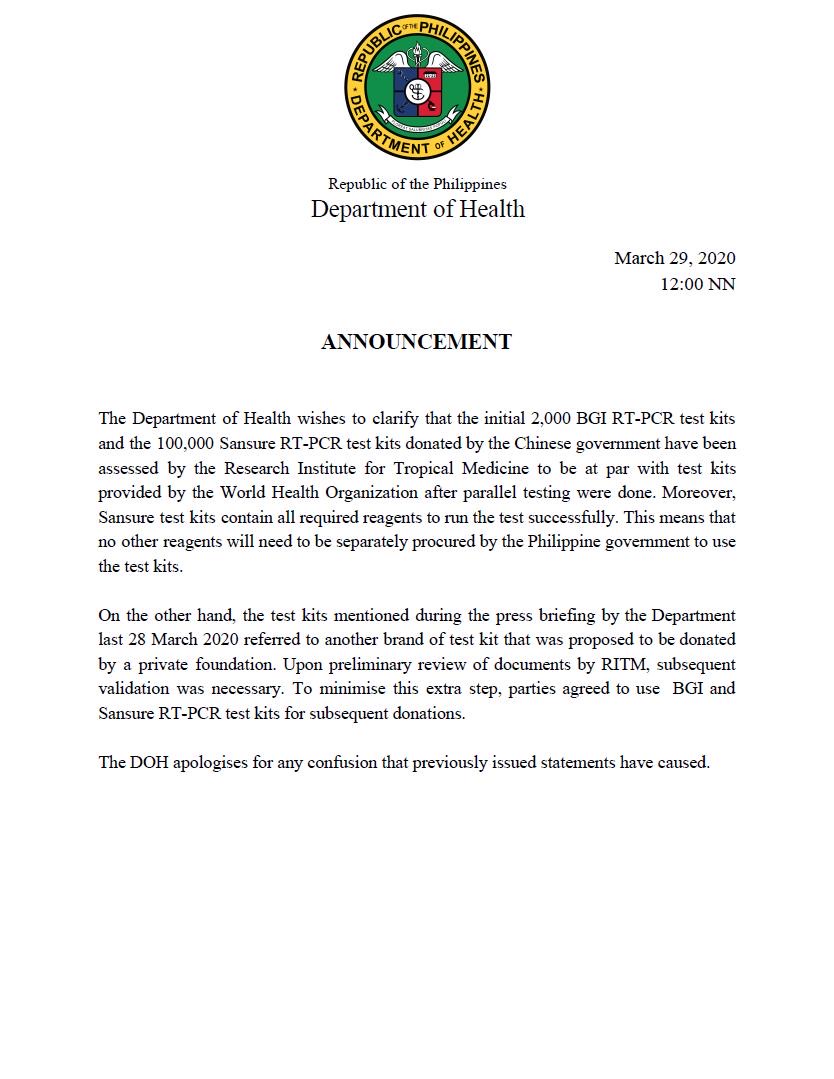 3月29日,菲律賓衛(wèi)生部發(fā)布公告,對有關中國援菲新冠肺炎檢測試劑質量的事宜作出澄清。