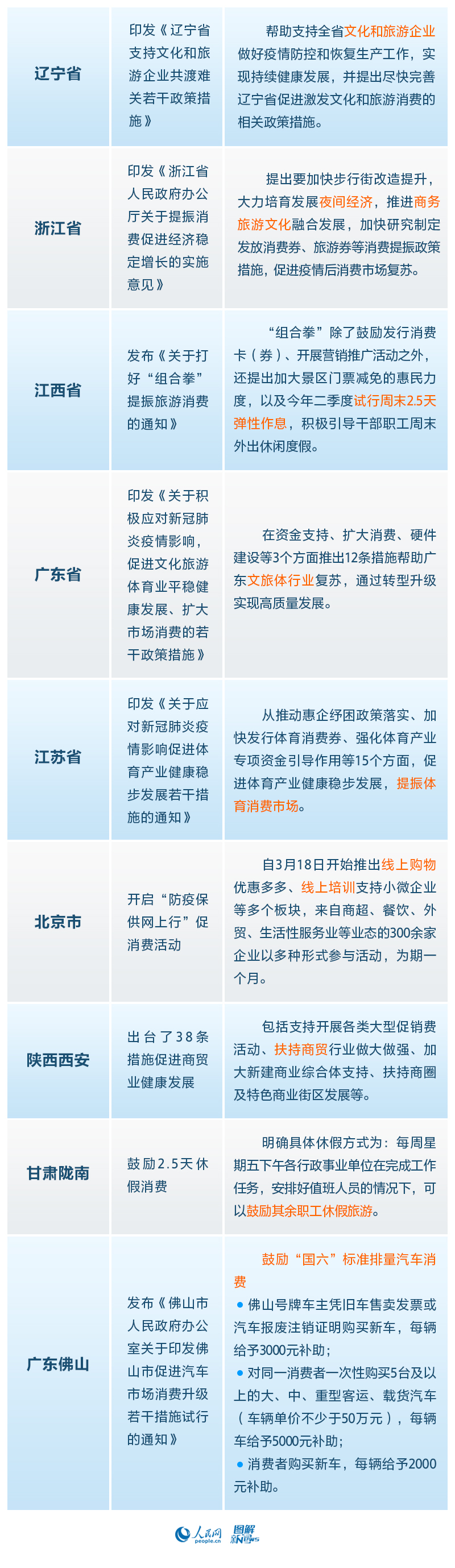 自疫情發(fā)生以來(lái),全國(guó)多省區(qū)市已經(jīng)在因地制宜、因時(shí)制宜地出臺(tái)文件和實(shí)施辦法來(lái)應(yīng)對(duì)疫情帶來(lái)的沖擊。2月13日,北京市人力資源和社會(huì)保障局新聞發(fā)言人介紹了北京市出臺(tái)的系列援企穩(wěn)崗政策;2月17日,江蘇省出臺(tái)《關(guān)于疫情防控期間穩(wěn)就業(yè)保用工的工作措施》;2月20日,廣東省印發(fā)《廣東省進(jìn)一步穩(wěn)定和促進(jìn)就業(yè)若干政策措施》;3月13日,合肥市出臺(tái)《合肥市疫情防控期間穩(wěn)就業(yè)相關(guān)政策實(shí)施細(xì)則》;3月17日,貴州省印發(fā)《促進(jìn)2020年高校畢業(yè)生就業(yè)創(chuàng)業(yè)十條措施》;3月27日,湖北省政府辦公廳印發(fā)《關(guān)于應(yīng)對(duì)新冠肺炎疫情影響全力以赴做好穩(wěn)就業(yè)工作的若干措施》……此外,各地也因地制宜,出臺(tái)新政提振消費(fèi)。從推進(jìn)融合到扶持特色商圈,從鼓勵(lì)休假消費(fèi)到給予購(gòu)車補(bǔ)貼,多渠道發(fā)力,推動(dòng)經(jīng)濟(jì)復(fù)蘇。